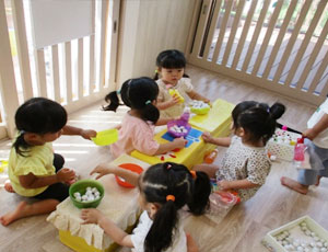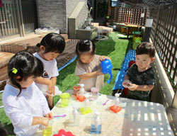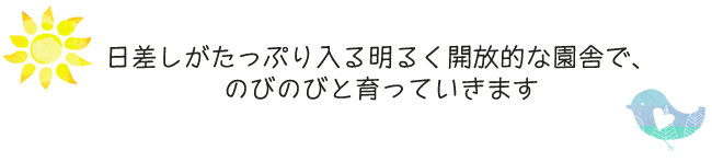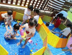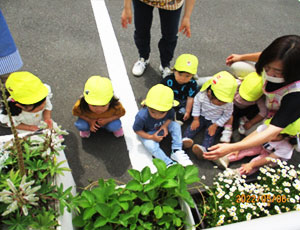 お花がきれい・・・。風が気持ちいい・・。などなど)に驚いたり、楽しんだりしています。また園の小庭で砂遊びや水遊びを楽しみます。子どもたちの笑い声溢れる園に、