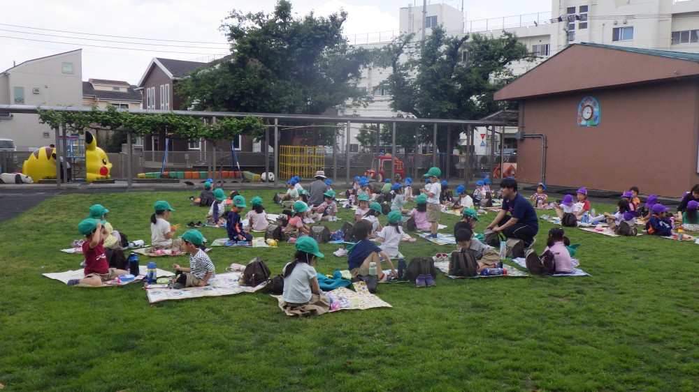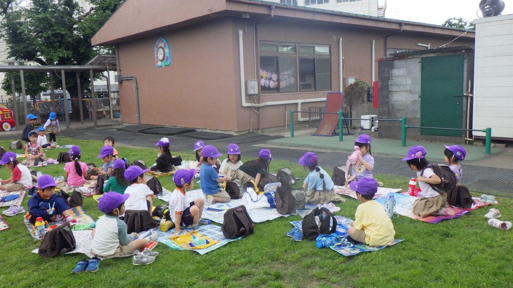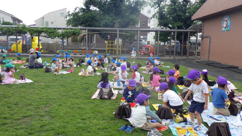 芝生の園庭でピクニック気分。 2年生がレジャーシートを敷いて園庭でお弁当タイム。お外で食べるお弁当は特別に美味しいね。