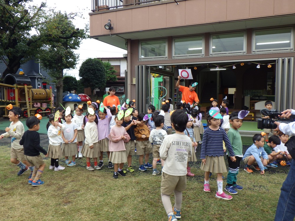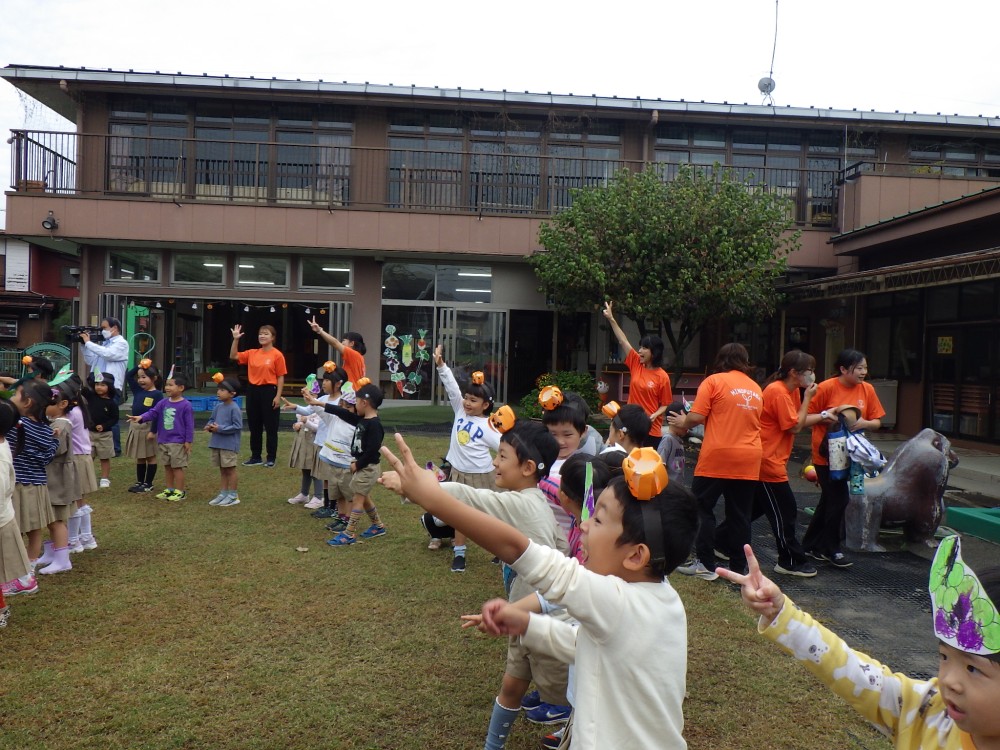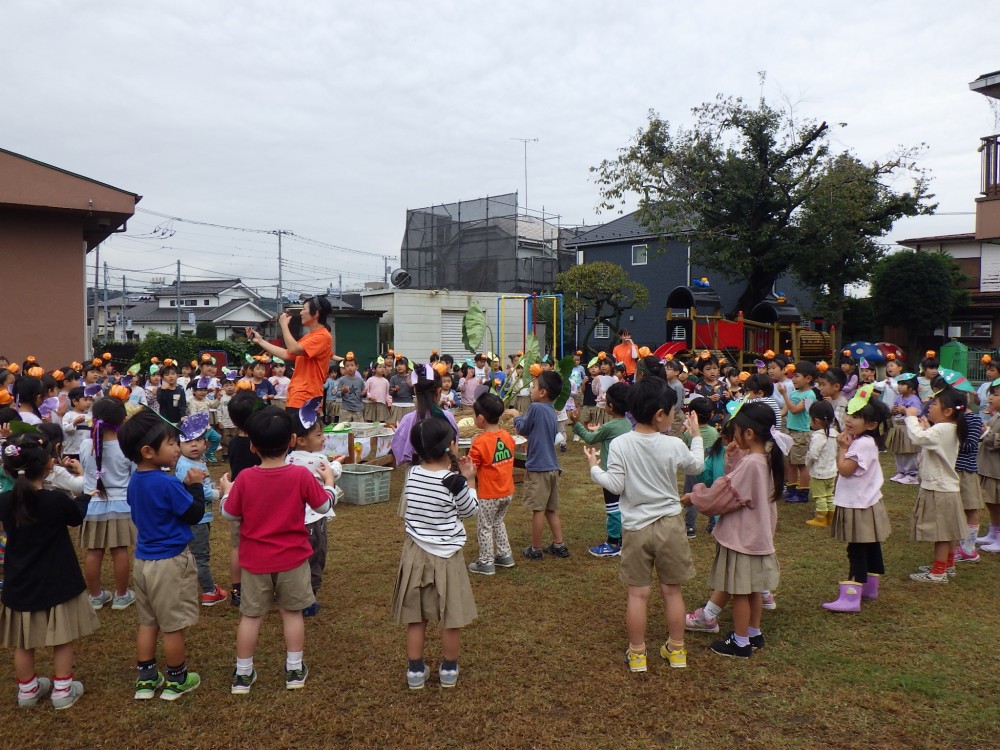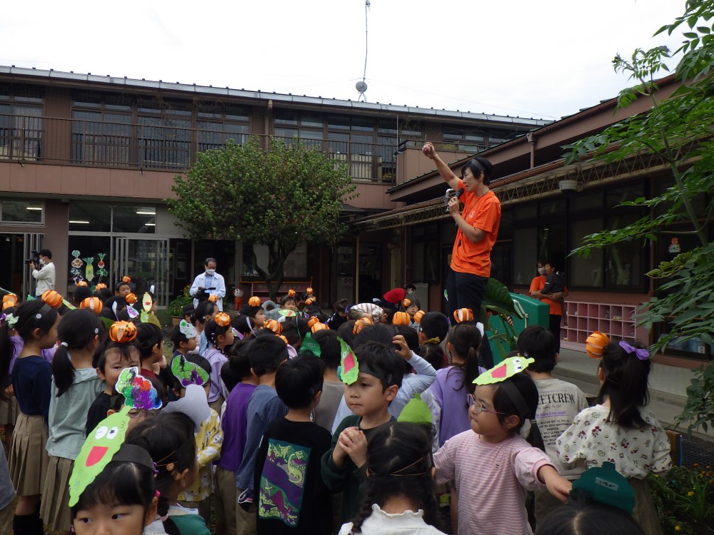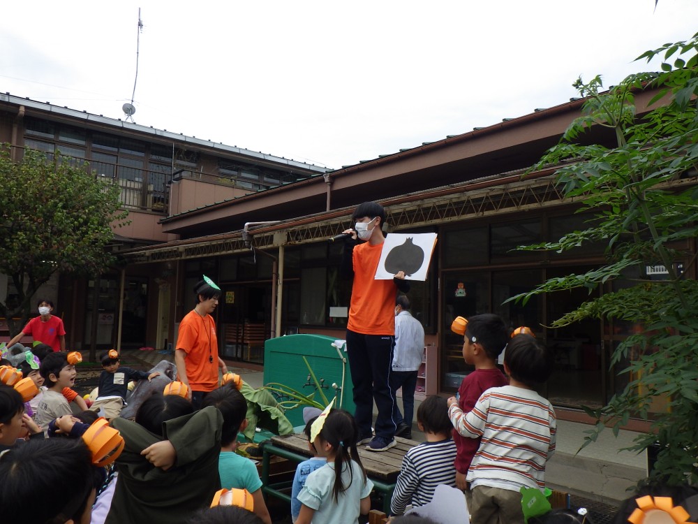 収穫感謝祭では、4学年入り交じってゲームや歌、踊り、クイズ大会で盛り上がりました。畑でとれた大きなおいもや里芋の葉っぱにみんなびっくり。